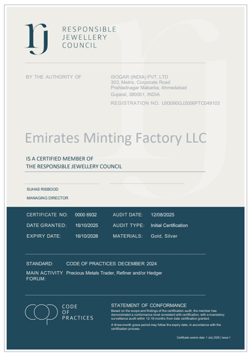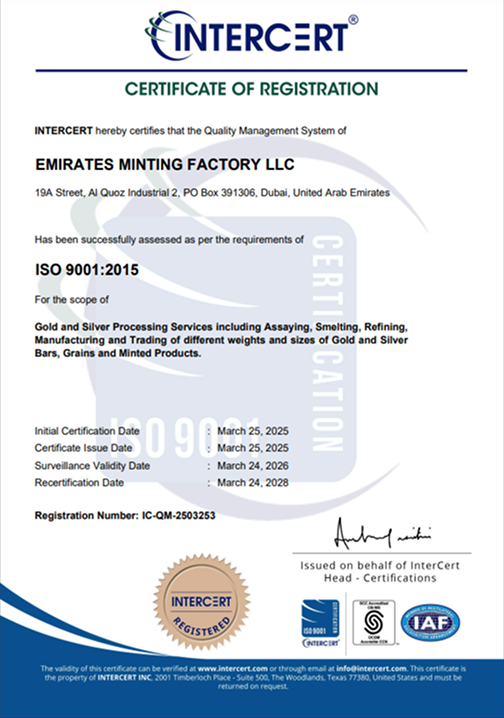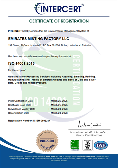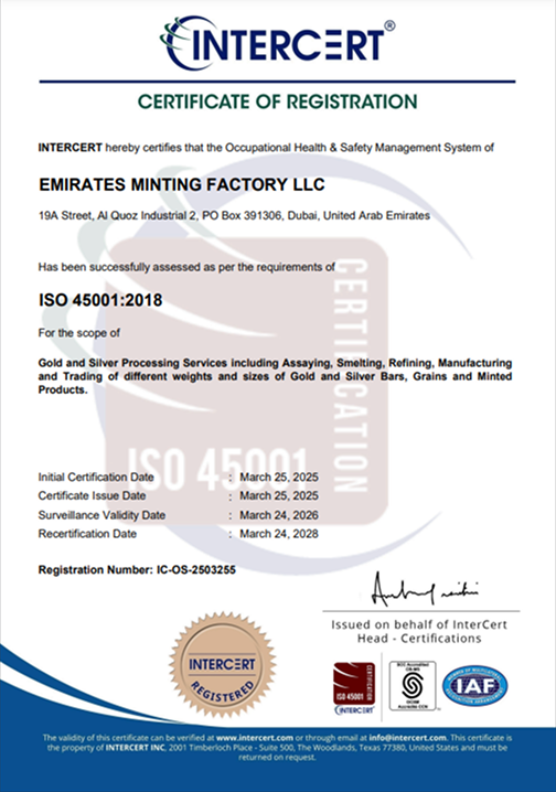 At Emirates Minting, we are committed to excellence, sustainability, and responsible practices in every aspect of our operations. Our internationally recognized certifications reflect our dedication to quality, environmental care, and the highest standards of safety and integrity.
